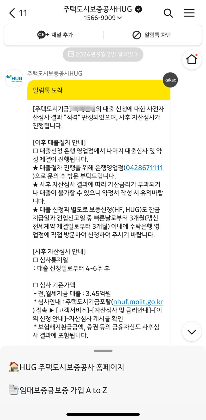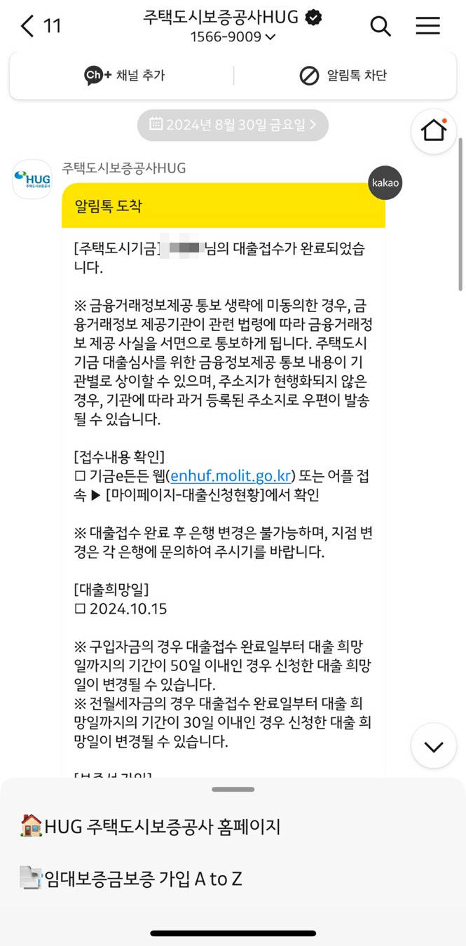 신청 후 "신청 완료 카톡"이 HUG 에서 옵니다.